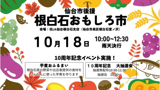 あそぶ・過ごす 根白石おもしろ市が10周年!10月は芋煮ふるまいや抽選会も実施 仙台市泉区根白石で恒例となっている「根白石おもしろ市」が、10月18日(土)に開催されます。会場は旧JA仙台根白石支店(根白石堂ノ沢)。時間は10:00〜12:30で、雨天でも実施されます。この市は、地域の農家や出店者が毎月集まり、季節の農... 2025.10.16 あそぶ・過ごす