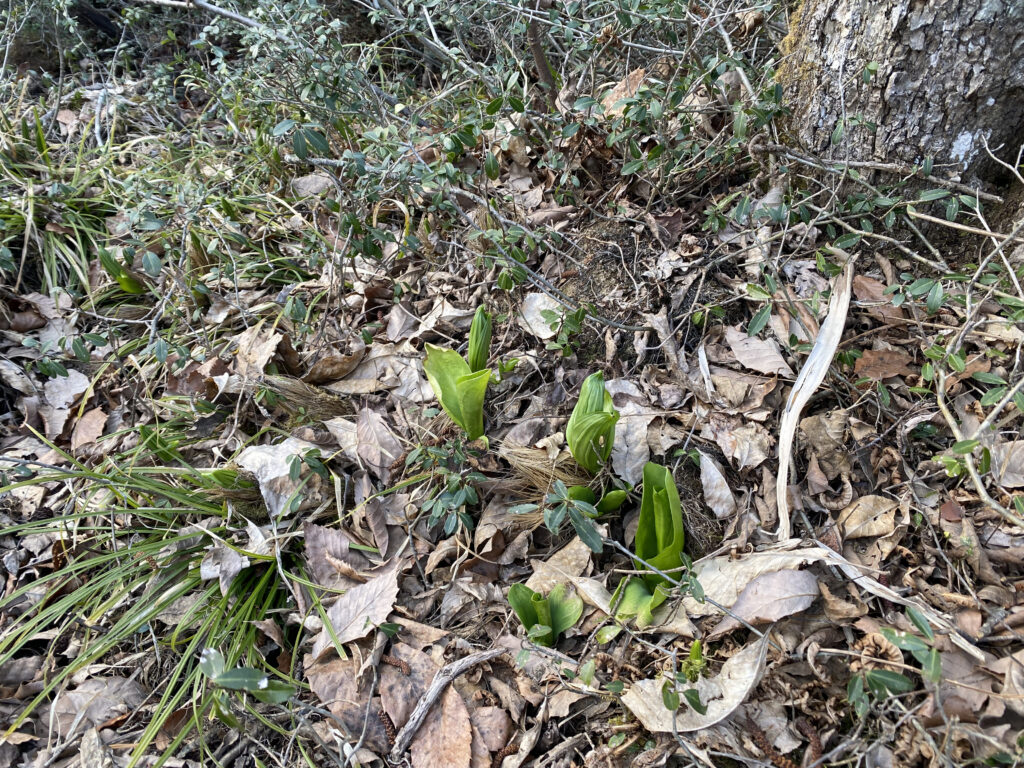 地面から顔を出したミズバショウの新芽は、あちこちに点在し、日当たりのよい場所ではすでにしっかりした葉を広げ始めている株も見られました。