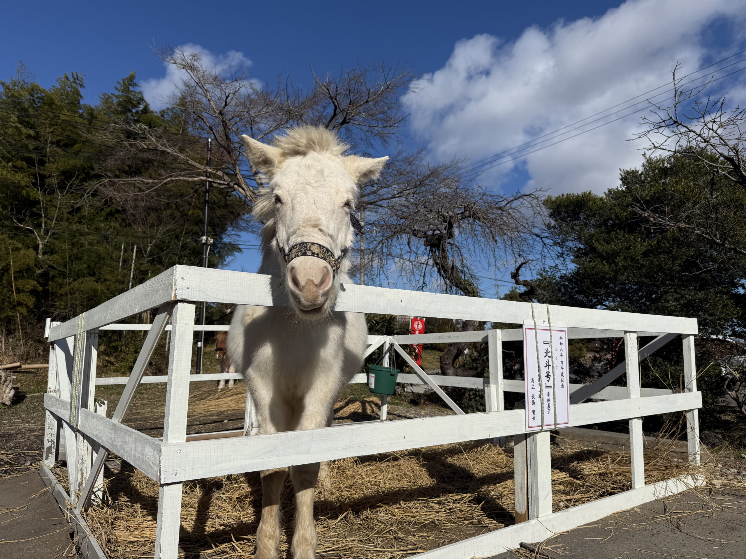 この白い馬は、令和8年丙午歳を記念した奉納展示で、「北斗号」という名前だそうです。令和7年元旦生まれの一歳。奉納展示というのは、神社に奉納されたものを一定期間、そのまま見られる形で展示するものですが、絵馬や置き物ではなく、実際の馬が奉納されているのはなかなか珍しいと思いましたがどうでしょう?