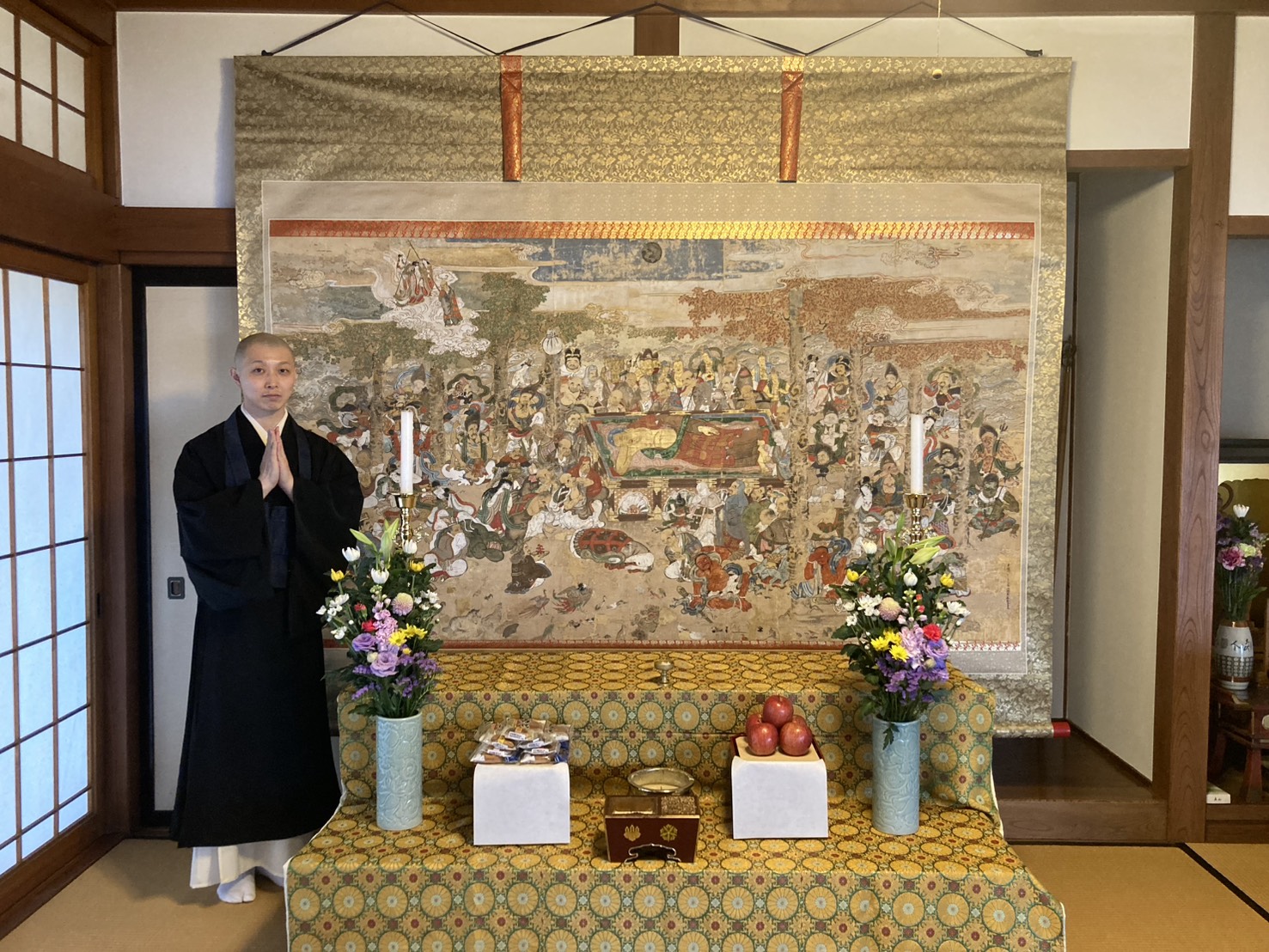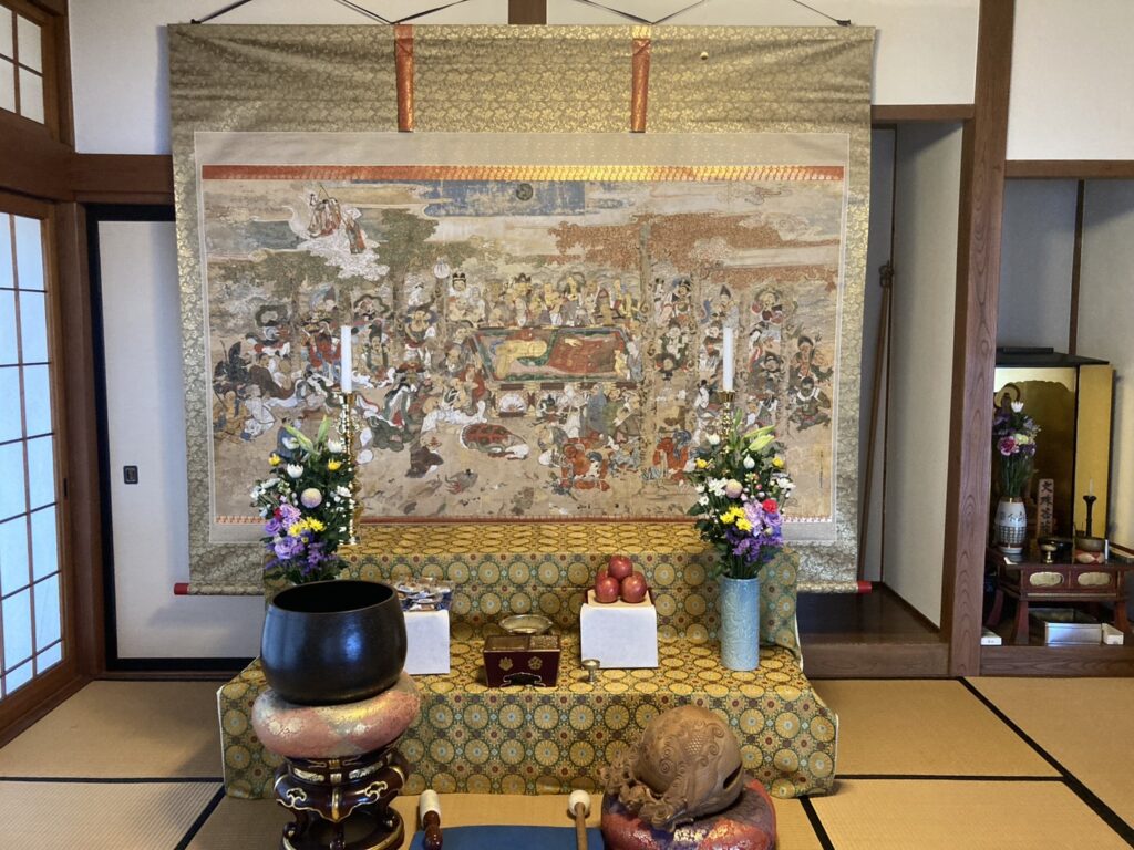 涅槃図は、単に死を描いたものではありません。 「“いのちの終わりを通して、教え(無常・慈悲・悟り)を感じ取るため”の仏画です」と時副住職。