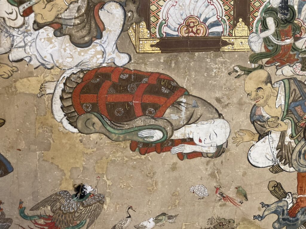 お釈迦様の実母である摩耶夫人は、お釈迦様を産んで7日目に亡くなられました。この絵では、我が子の死を聞きつけた母が、雲に乗って天女たちと共に薬を持って現れる姿が描かれています。 「しかし、もう間に合わないと思い、雲の上から薬を投げるが、木の枝に引っかかってしまった……という切ないエピソードも残されているんですよ」