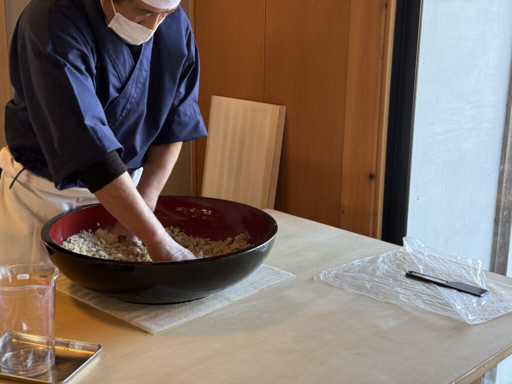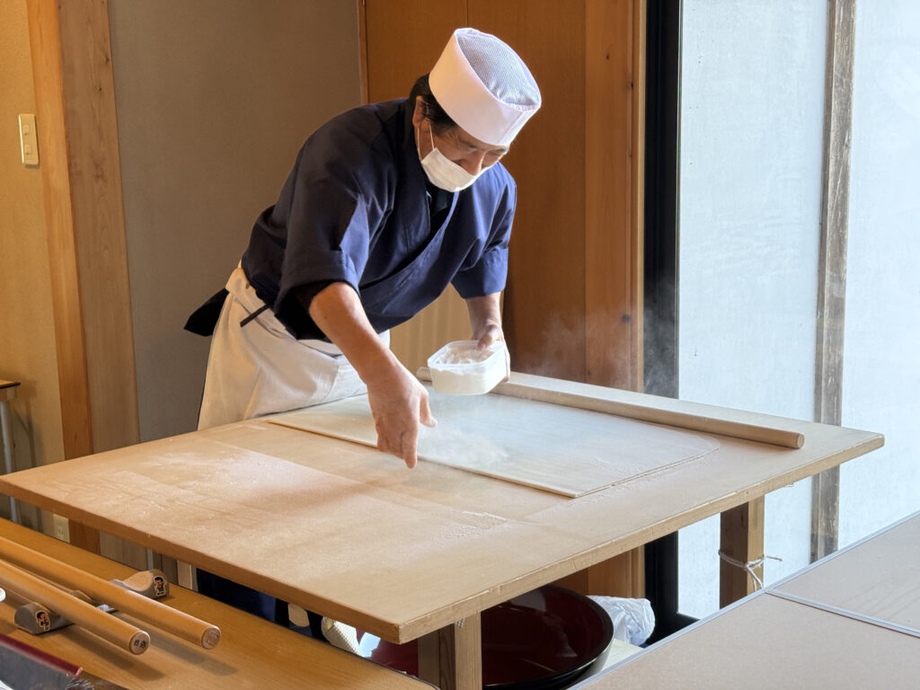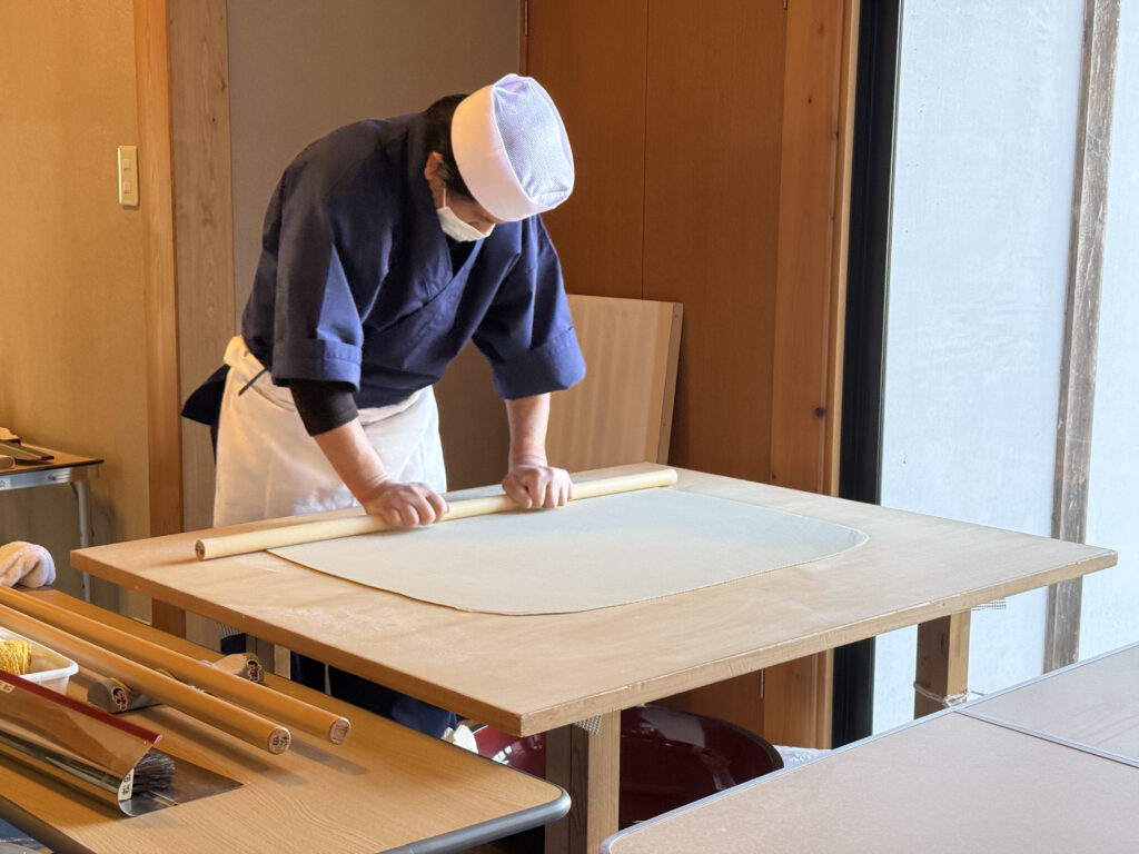 会館に入ると、入り口近くで宮城手打ちそば研究会の方々が蕎麦打ちをしていました。生地をのばして切る作業が続いていて、その前で自然と人が立ち止まります。