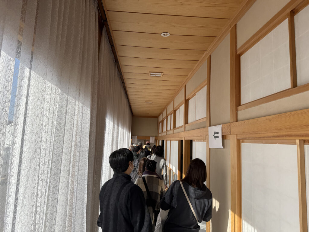 さて、ずっと蕎麦打ちを見ているのも楽しいですが、本題のおそばをいただきに列に並びます。会館の奥の通路に列が伸びていました。