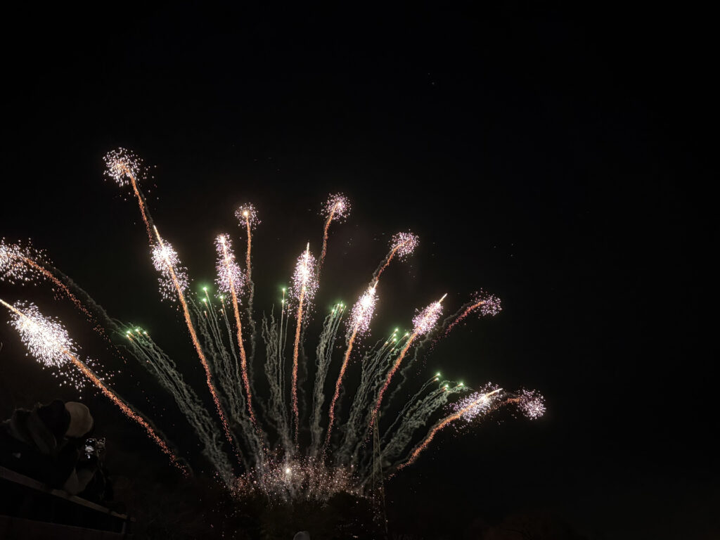 驚いたのはその距離感です。今回の打ち上げ場所は、ゲレンデ内ではなく「駐車場の一部スペース」。そのため、観覧場所から見上げる花火は凄まじい迫力で、まるで火花がそのまま頭上へ降り注いでくるかのような臨場感に圧倒されました。