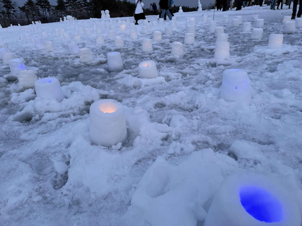 まずはメイン会場の一つ、泉ピークベースへ。足元には「スノーキャンドル」が優しく並び、大小さまざまな雪だるまたちが来場者を出迎えてくれる、なんとも可愛らしい雰囲気です。
